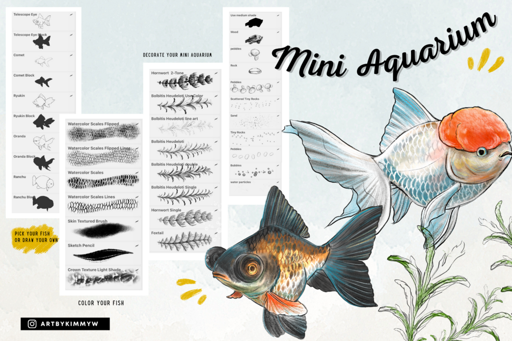 This brush pack is designed for drawing goldfish and decorating the interior of fish tank. You can easily paint and modify any goldfish / fish with my Scale Brush + Scale line brush