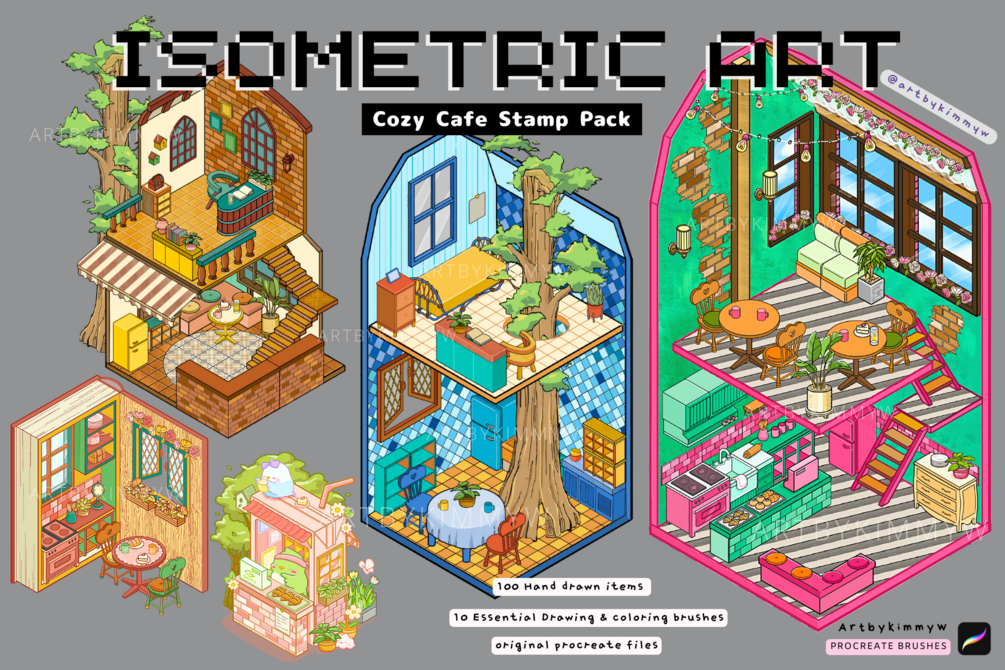 Create your own isometric room/ cafe buildings with my hand drawn stamps in minutes! Endless possibilities 💜